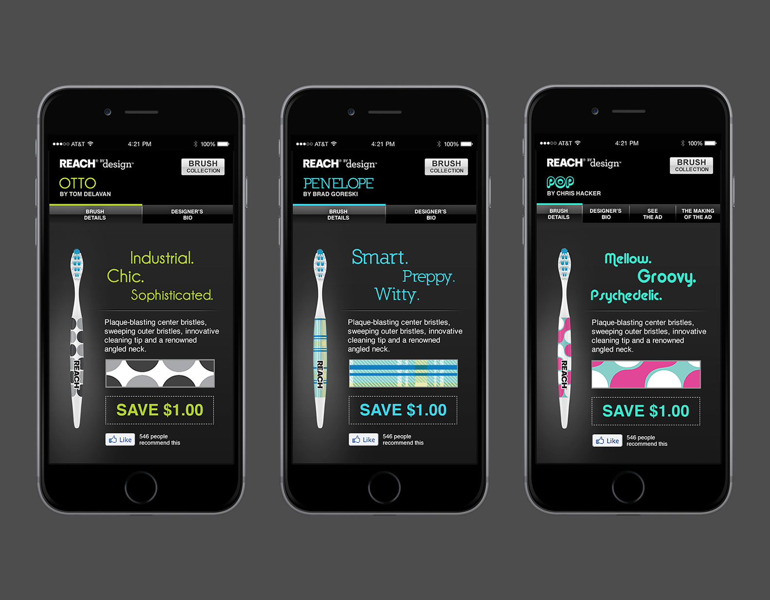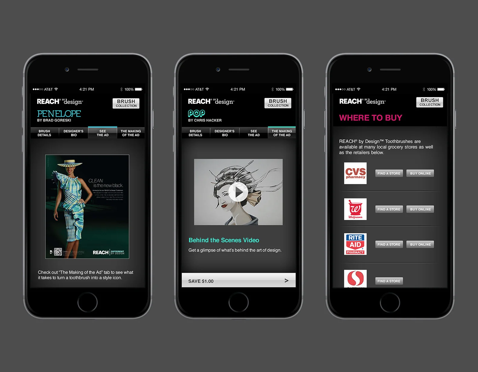 Role: Lead designer for "REACH by Design" micro site. Site pages include product profiles, video clips, advertising, and store locator.